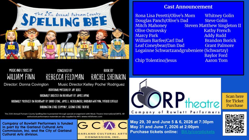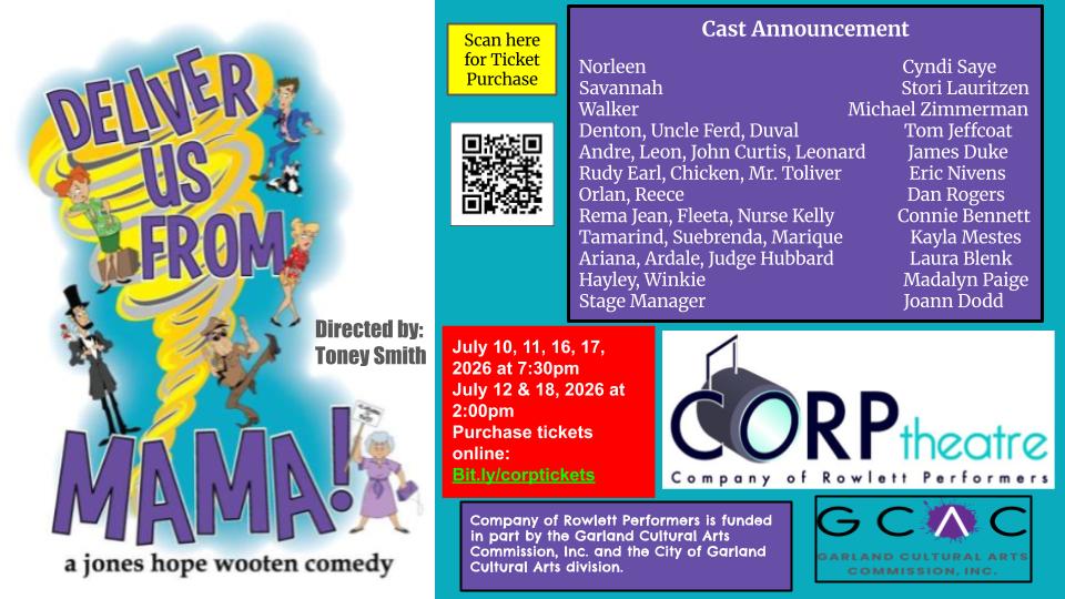 For personal assistance with tickets call the BOX Office at 972-205-2790 between 9am-4pm. For any other CORP questions please email donnacovington@yahoo.com or CALL 972-977-7710 .